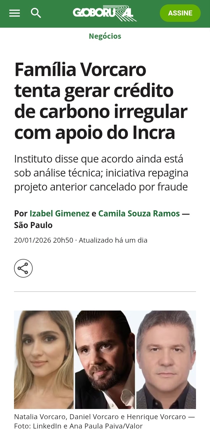 Família Vorcaro tenta gerar crédito de carbono irregular com apoio do Incra